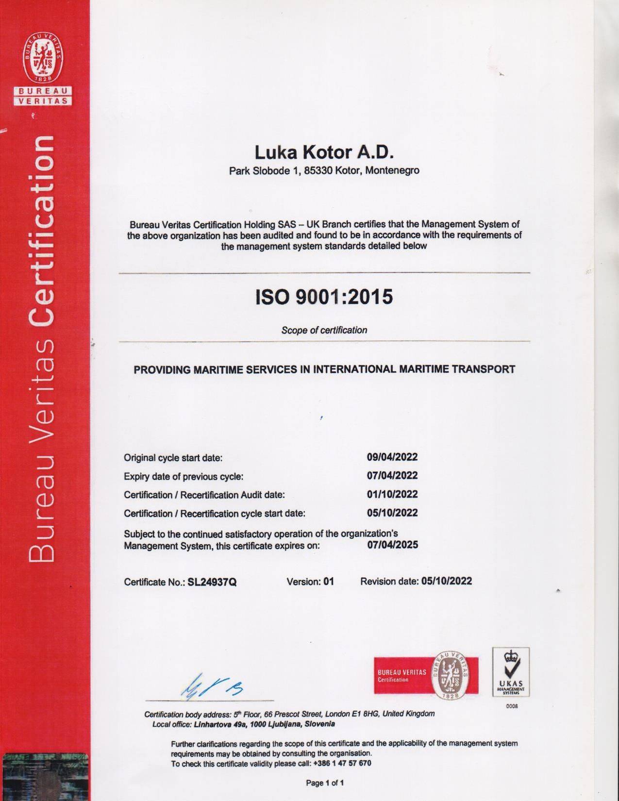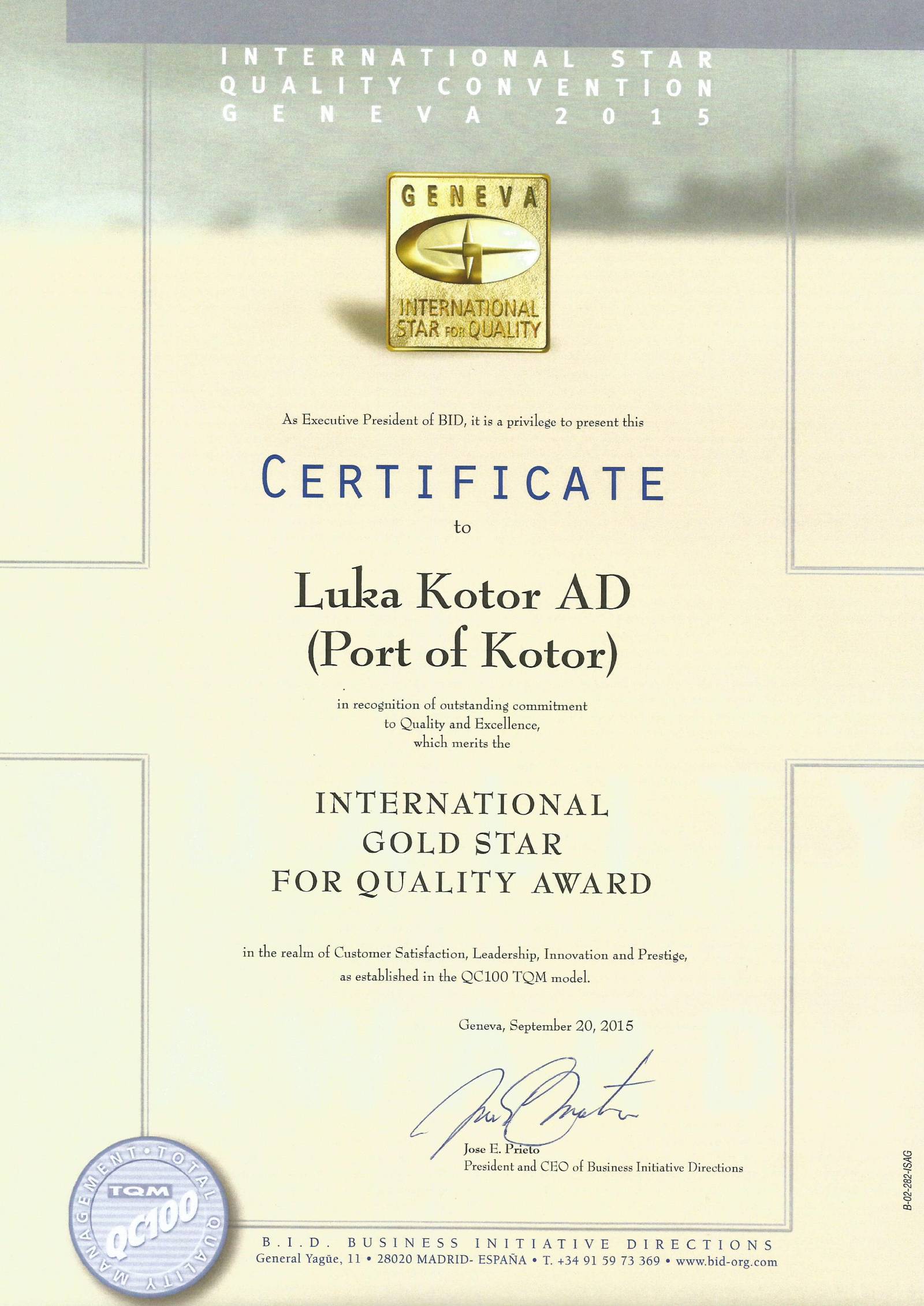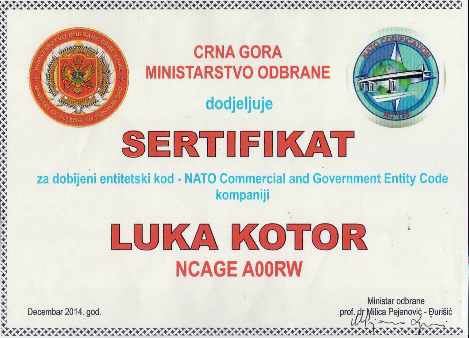 Pored uvedenih standarda kvaliteta ISO9001 i ISO14001, Luka Kotor posjeduje sertifikat za NATO kod komercijalnog i državnog entiteta dobijenog od Ministarstva odbrane RCG.