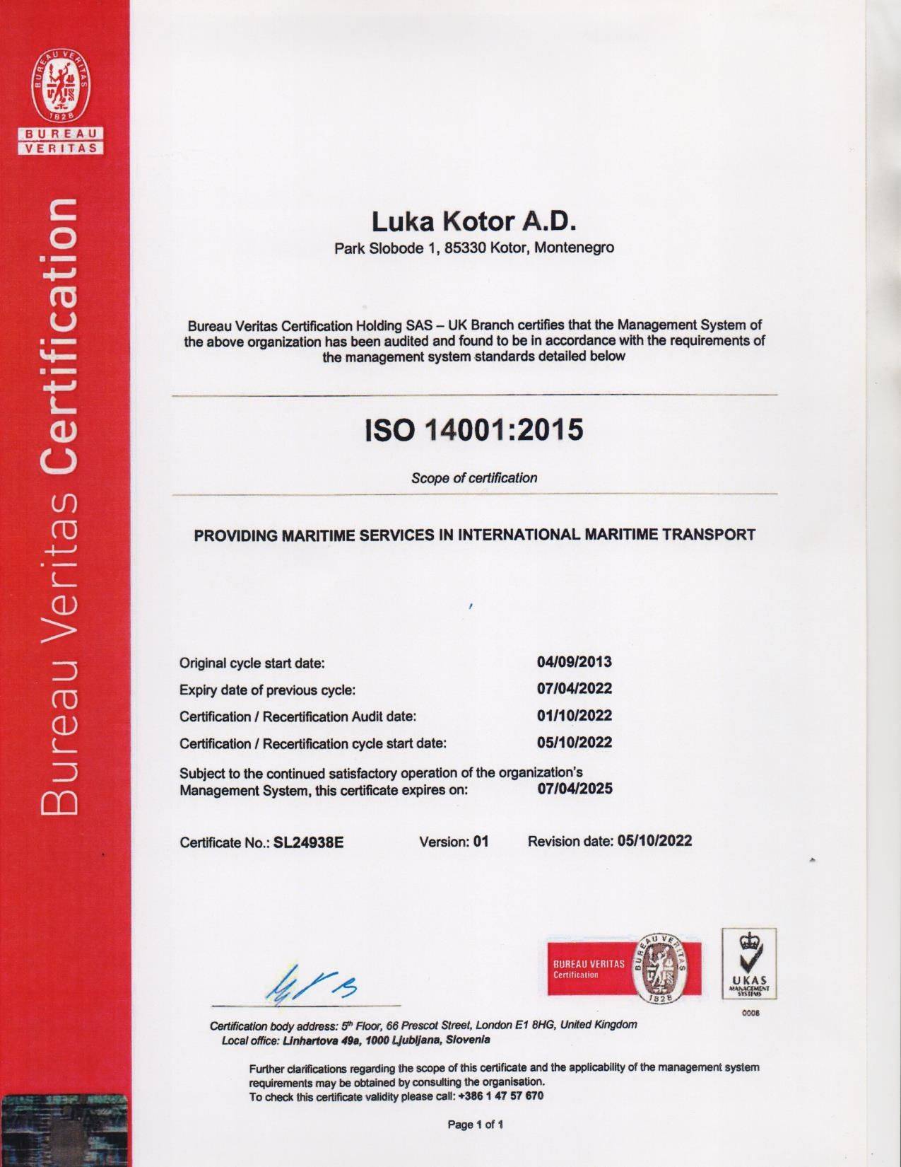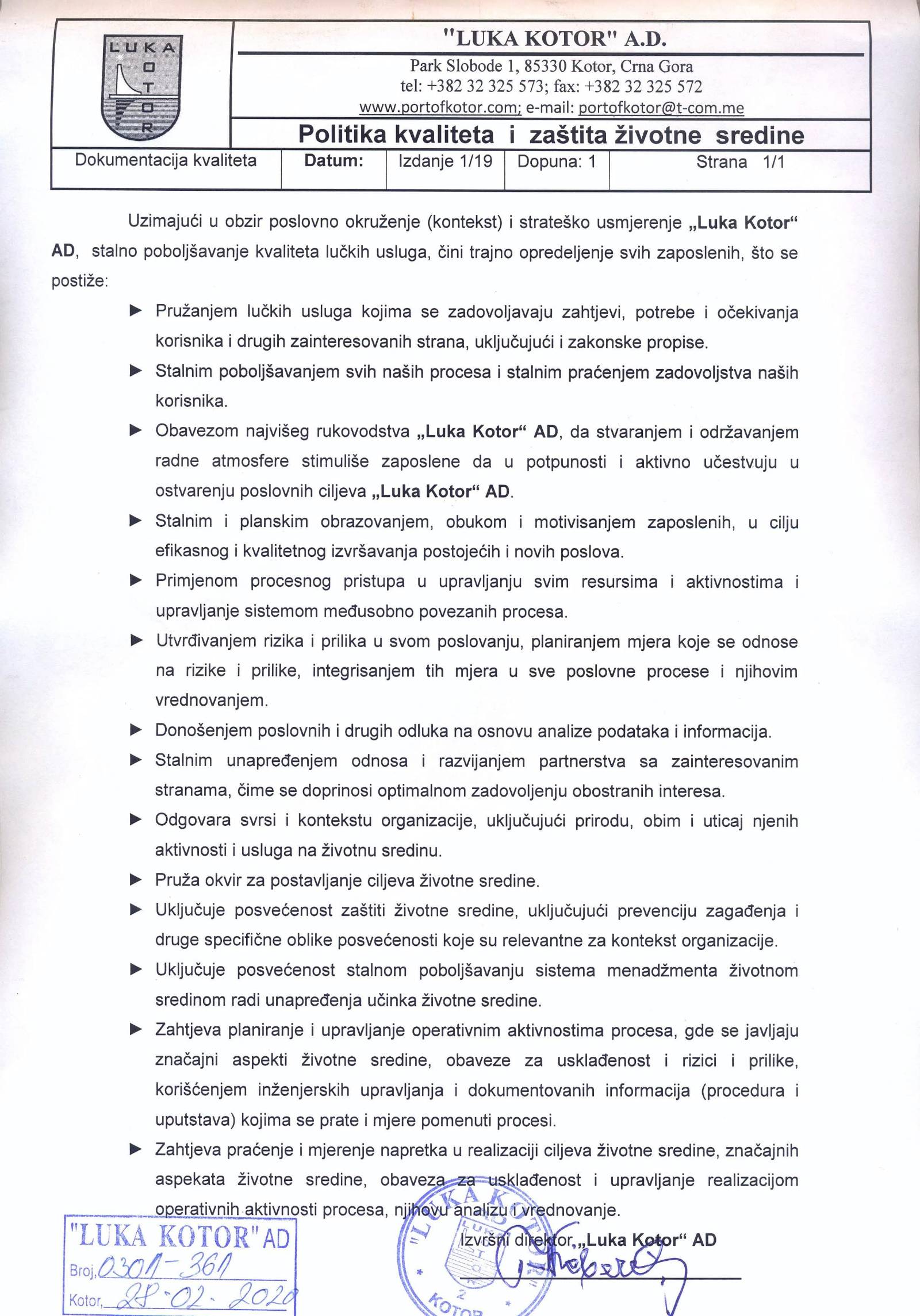 Luka Kotor permanentno radi na podizanju kvaliteta svojih usluga i stalnim unapredjenjem procedura u poslovanju kao i podizanju ekološke zaštite našeg akvatorijuma.